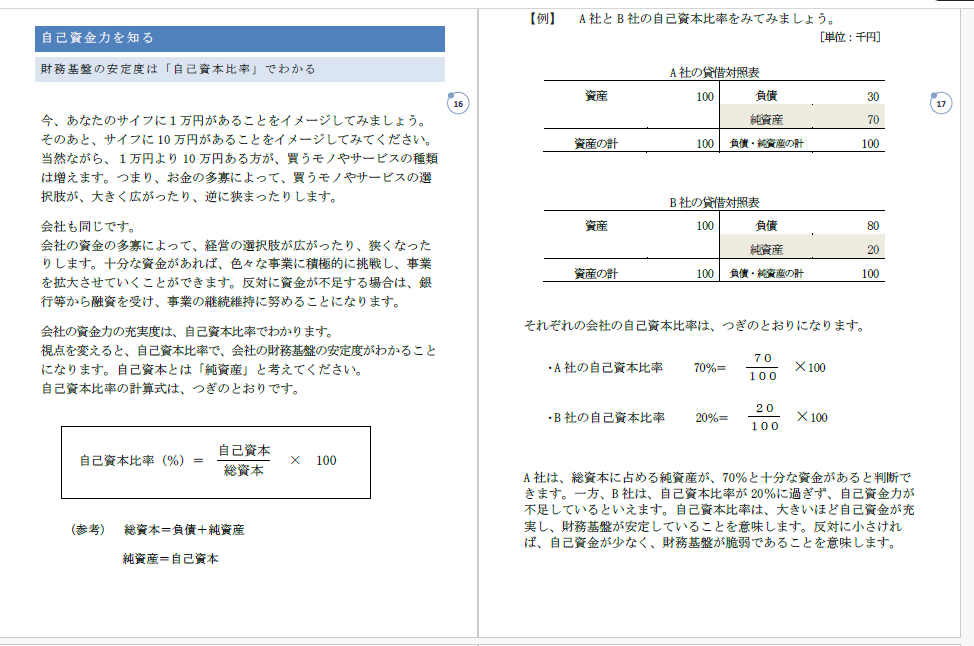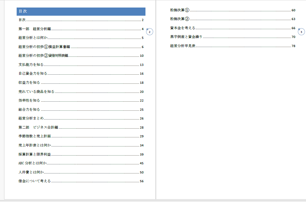 講義編は、経営分析編とビジネス会計編の2つで構成された全79ページ。経営分析編は、決算書を使った経営状況の把握、ビジネス会計編は、実践的に役立つ数字を紹介しています。